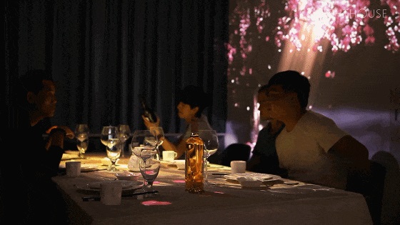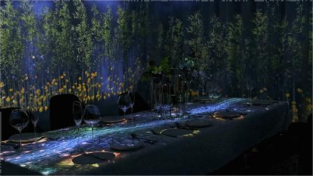 比如,由lighthouse lab打造的武汉首家沉浸式音乐餐厅在饮餐同时又能感受山泉流水,竹林花香, 流星闪烁,碧波荡漾 。整个房间只设一张餐桌,且需提前预约,餐厅的墙壁和餐桌由虚拟影像组成。周围会自动切换场景仿佛置身于一个虚拟的世界中器皿,美食与动态影像互相搭配。在吃饭的同时, 甚至还会有蝴蝶,鱼儿逗留穿梭。