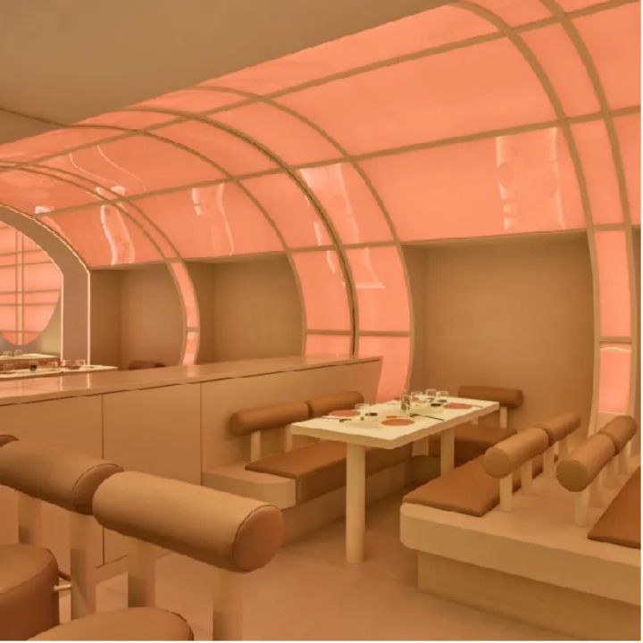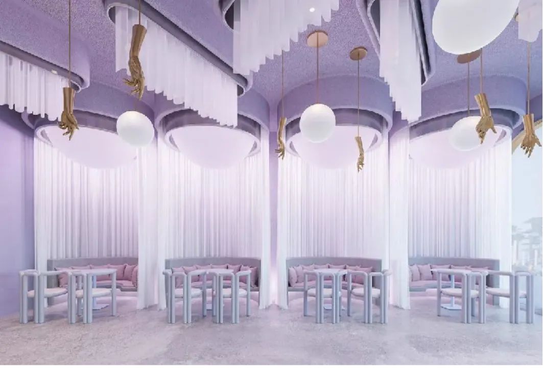 随着元宇宙呈现强劲的发展势头,虚拟设计及其对实体设计的影响越来越紧密地交织在一起。数字美学对实体空间的影响从未如此突出。数字风格的色彩和材料色调创造了沉浸式的梦幻和惊叹感受。粉蜡色与霓虹色相结合,哑光和金属或发光饰面与弧形形态、渐变效果和线性灯带混合起来,创造感官游乐场的数字现实幻象。
